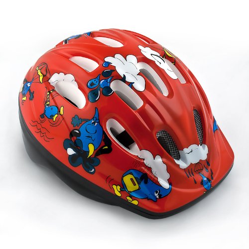 Le casque de vélo rouge avec des images amusants a des ouvertures d'aération et une protection contre les insectes, qui peuvent y pénétrer. La sangle de sécurité peut être réglée individuellement et assure un ajustement sécuritaire. Le casque est adapté à la taille de la tète 52 -56 cm. Le casque est résistant aux chocs.